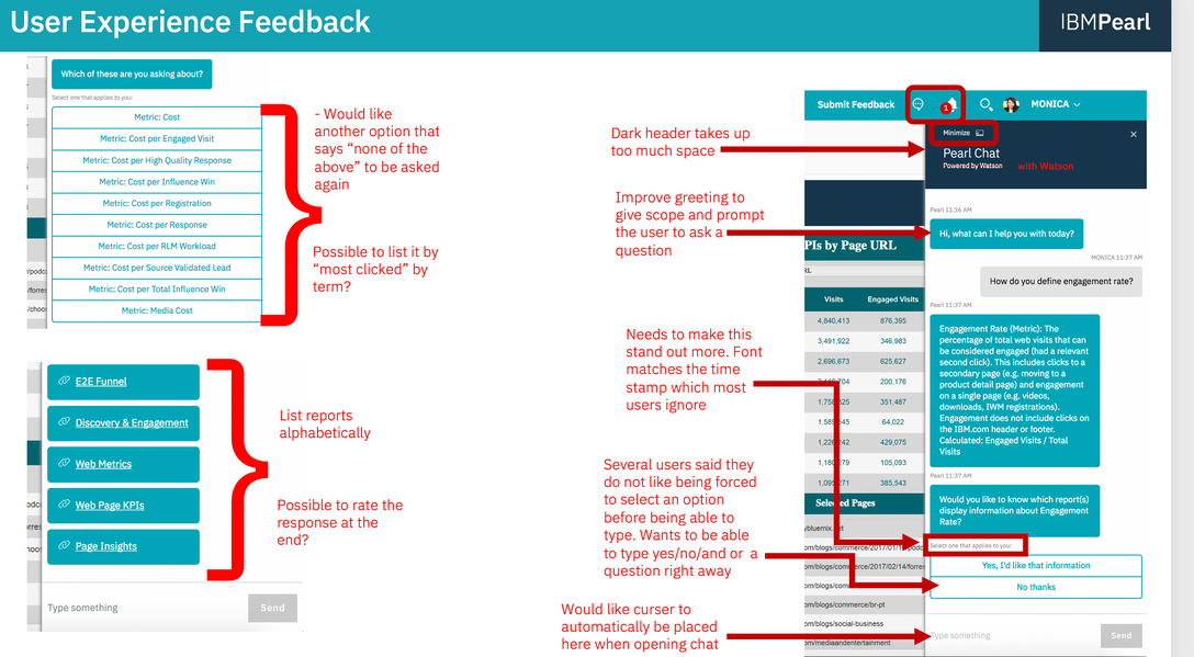 Conducted sessions with power users, IBM leadership, and dev to create a useful chatbot. Most chatbots try to mimic human interactions, which can frustrate users when a misunderstanding arises. Watson Assistant is more. It knows when to search for an answer. We did workshop sessions and this was used to define the MVP. Prototypes were created to assess the value. We established an agile process of working sketch sessions, followed by simultaneous logic architecture and wireframes. Once we had validated with our users, we developed the feature and created a method for other teams to beta-test. In accordance with the agile workflow, we presented new features and roadmap every 2 weeks to stakeholders.